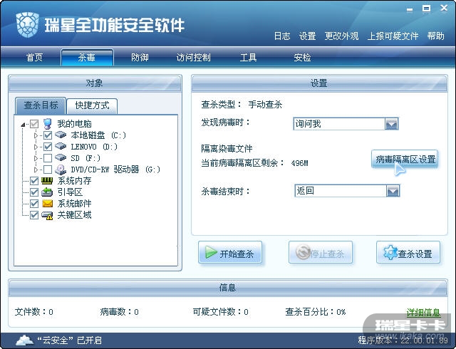 打开瑞星主界面 杀毒界面 查看当前病毒隔离区是否已经满了 如果满了 请点击病毒隔离区设置