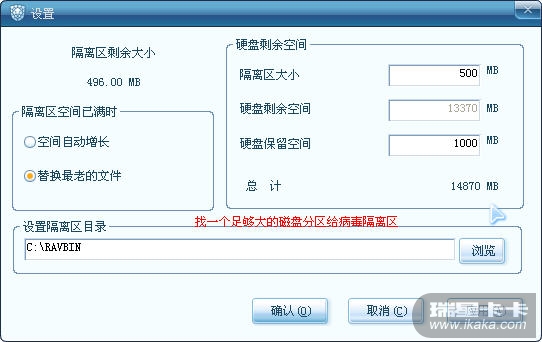找个 足够大的盘 做病毒隔离区的磁盘 然后确认 之后全盘杀毒即可