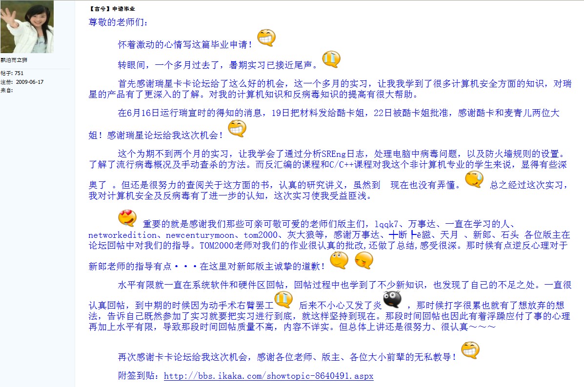实习生签到方式:本次实习生是从2010年1月29日在实习生专区公布的寒假实习生录取名单录取,并把录取的实习生加入到反毒学员用户组。在实习开始当日,每位实习生须在实习生签到区发布自己的签到帖,格式: