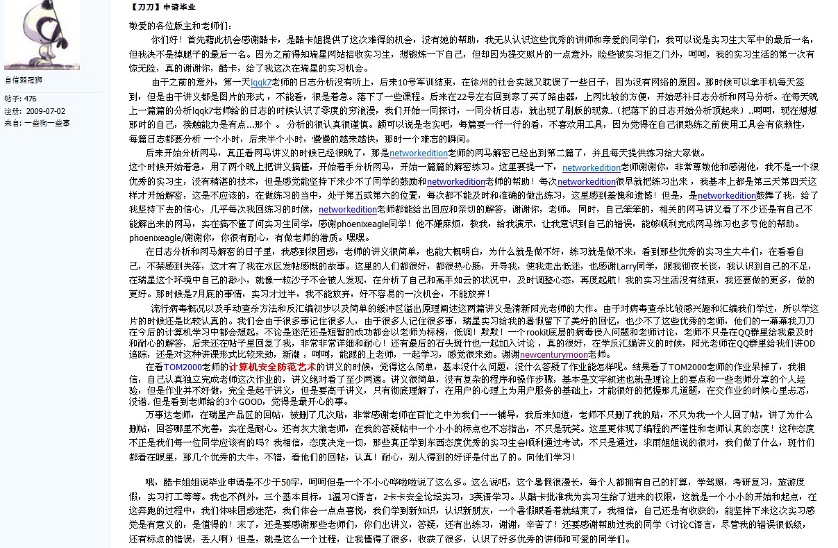 2、实习生毕业的回帖数量要求:每周在技术区的有效帖子数量不少于60帖,且整学期在技术区的有效回帖不少于400帖;