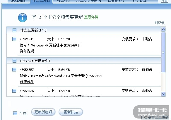 关于office方面的系统漏洞,可能与office是xp自带的简装版有关,建议卸载后安装完整版后,再修补。