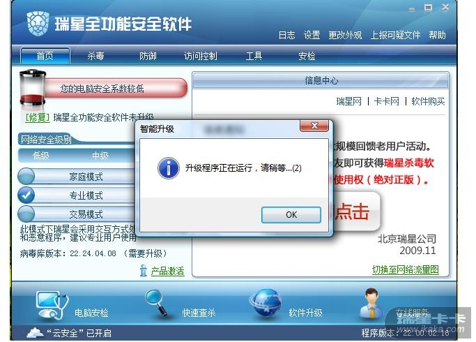 今天我打开瑞星全功能安全软件,瑞星说需要升级,而我点击升级按钮之后瑞星就这样了,然后我点击“ok"瑞星就没有反应了,这到底是怎么回事?怎么解决?
