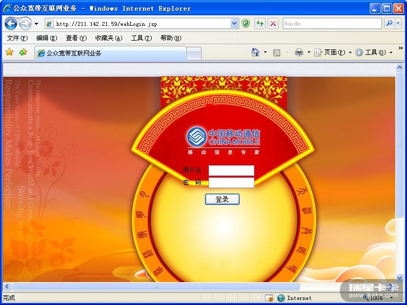 我是移动小区宽带,上网时打开移动网页输入用户名和密码,确定后会下载并运行移动的客户端程序。到此上网连接成功。