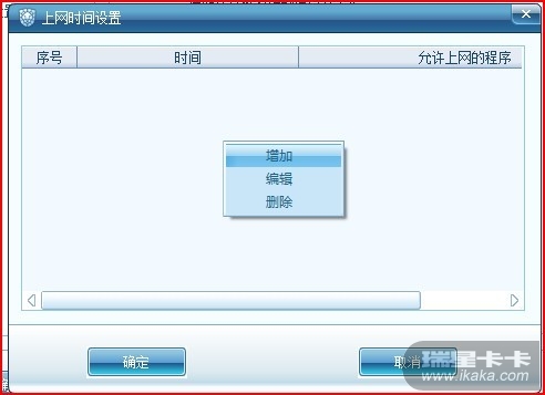 F、在上图空白区域点击右键出现右击菜单,点击『增加』菜单,弹出设置上网时间设置界面,在此界面中可以指定允许上网时间及允许上网的程序类型,根据自己的需要进行设置即可。设置后点击『确定』按钮即设置完成,设置时可以根据需要是否清空IE缓存。