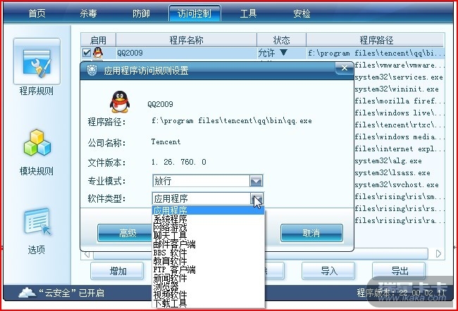 该设置中的“允许上网的程序分类”的确定需要在『应用程序访问控制』中手动设置,目前还不支持自动识别,默认都是“应用程序”,可以根据自己的需要更改该程序的程序类型,如图:
