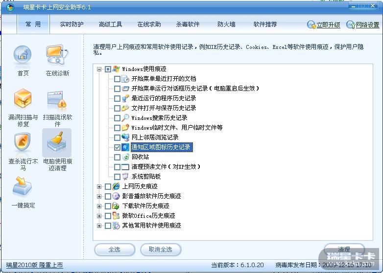 卡卡助手的“电脑使用痕迹清理”中的“通知区域图标历史记录”功能形同虚设,选择了后清理后