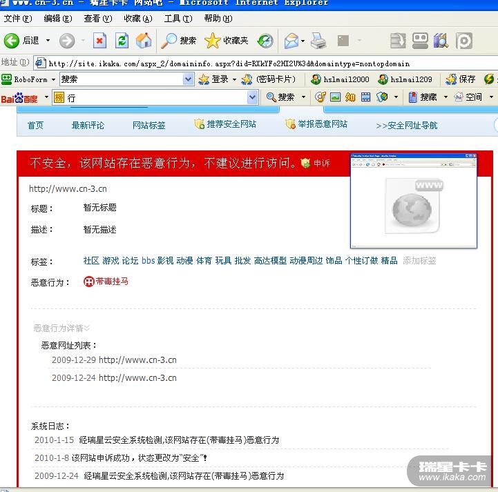 回复: 求助,已经加入瑞星云,显示安全认证,怎么瑞星还报毒 site.ikaka也显示毒挂马