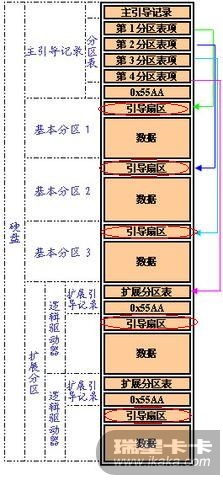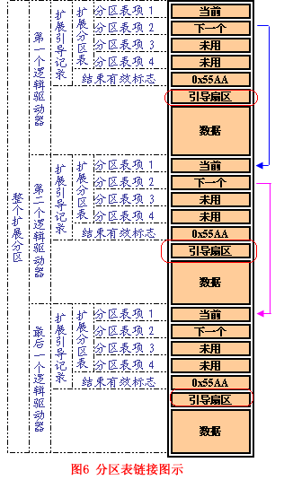 EBR:自MICROSOFT推出扩展分区的概念后,扩展分区就沿用了基本分区所采用的DPT结构,为了加以区别,人们通常把扩展分区的分区表所在的扇区称为EBR、EMBR、扩展MBR或虚拟MBR.