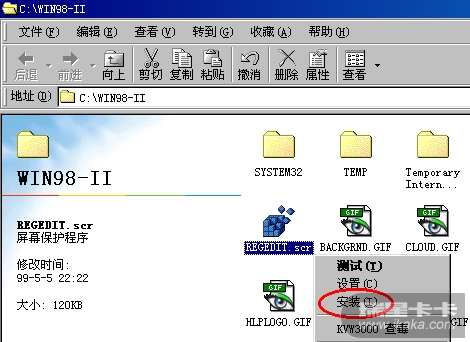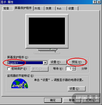 由于SCR文件在注册表中的特殊性,它的鼠标右键菜单中含有“测试”、“设置”和“安装”三个选项(图三),而鼠标右键菜单并不在禁止范围内。虽然前面两个选项被限制无法执行,但“安装”是通过RUNDLL32.EXE调用desk.cpl打开“显示属性”的“屏幕保护程序”页(图四),只要按一下“预览”键,哈哈,注册表编辑器就成功打开了。只要删除以上增加的键值,再重新启动计算机,限制?BYE-BYE!