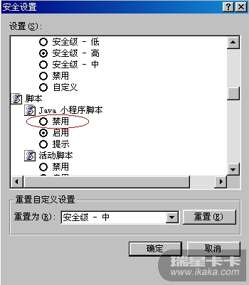 打开IE——工具——INTERNET 选项——安全——自定义级别——JAVA小程序脚本——禁用——确定(图五)