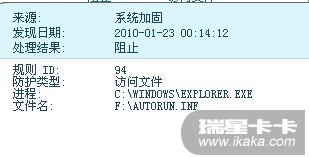 就算没有autorun.inf文件,系统自身的桌面进程也是会执行访问autorun.inf文件的命令的,2010瑞星的主动防御会常规性的阻止其访问autorun.inf文件的企图,并记录日志,哪怕没那autorun.inf文件,也一样阻止一次并记录日志。 也就是阻止并记录一次桌面程序的访问autorun.inf文件的命令。