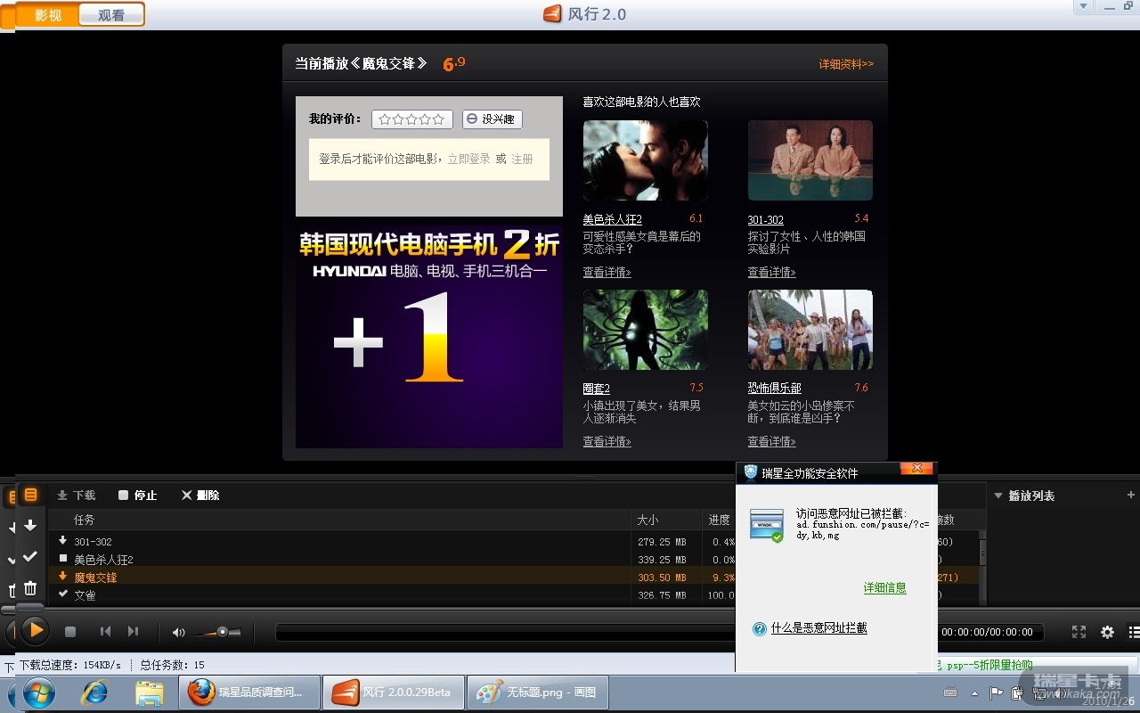 在风行内嵌的浏览器中 点击播放电影时,瑞星总是报警???