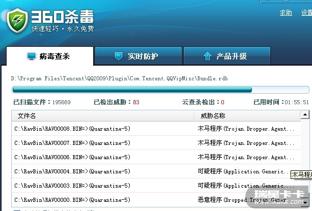 您既然使用了瑞星,为什么还要使用360杀毒呢?用两种杀毒软件本身就会为自己的系统带来隐患,不是安全软件越多越好。安全软件也讲究搭配,而不是简单的罗列。当然,可以用360杀毒作为辅杀,但使用辅杀有前提:两个软件一定要相互排除,否则一定出问题。这不是瑞星和360之间的问题,你换做任何两个杀毒软件都会出现这样的问题。所以初级用户不建议用两个杀毒软件。