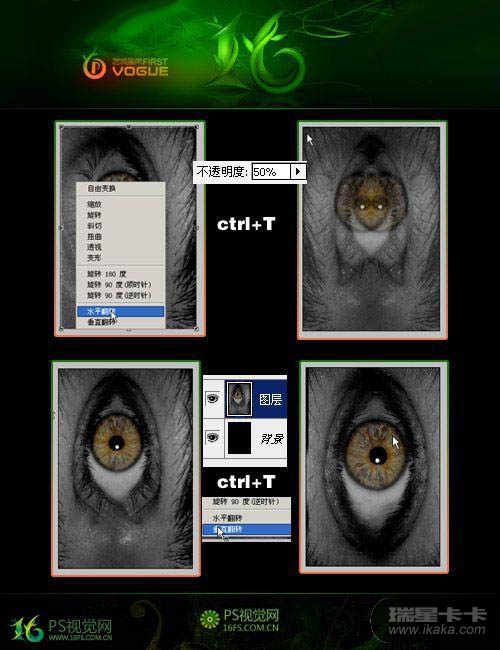 2、我们发现眼睛不规则,做出来图不好看,我们把它修饰得顺眼一点。复制一层,ctrl+T,水平翻转图层,调整图层不透明度50%,移动图层使眼球在同一个位置,透明度改为100%,加蒙版,把不要的地方摸去,效果大致如图,向下合并,再复制一层,ctrl+T,垂直翻转,蒙版修饰,方法同上,效果如图: