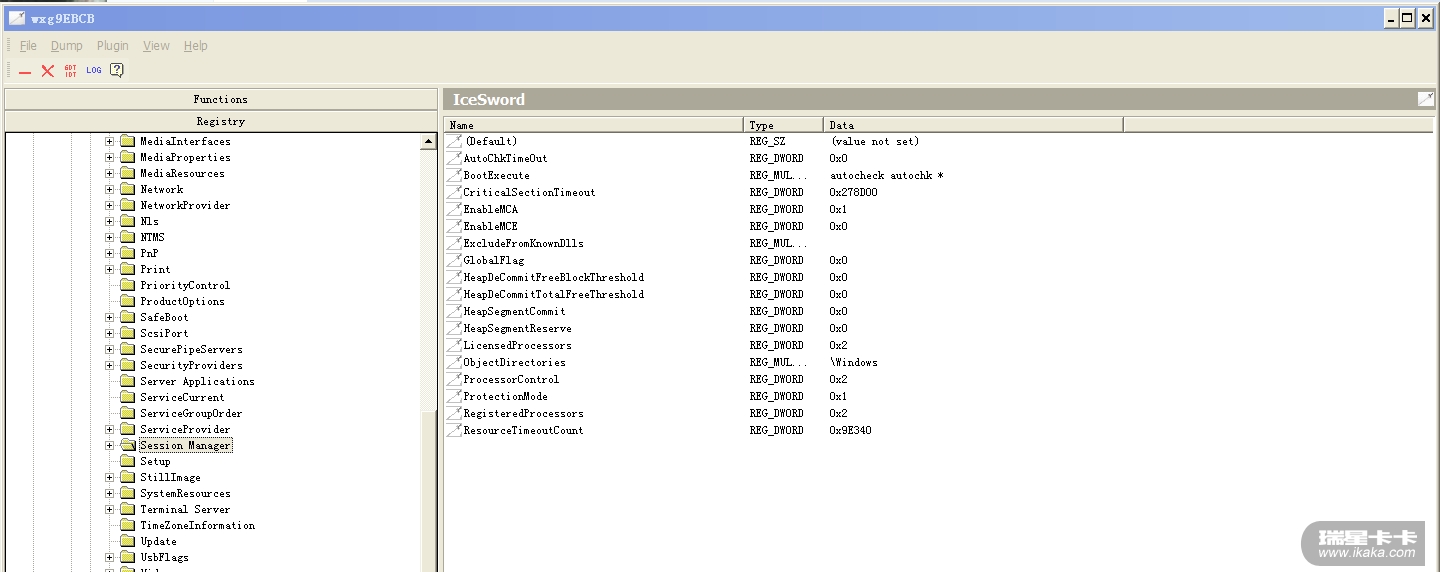 6、打开注册表编辑器,展开HKLM\SYSTEM\CURRENTCONTROLSE\CONTRL\SESSION MANAGER\,用IceSword删除键值: pending file rename options。