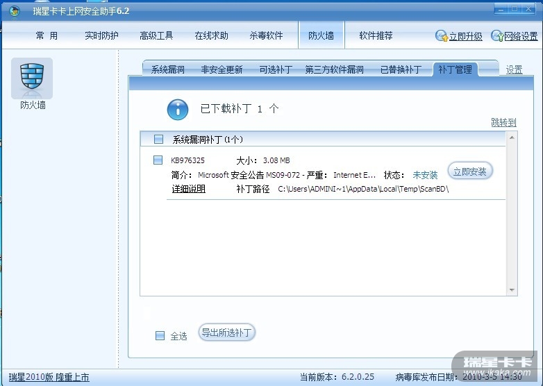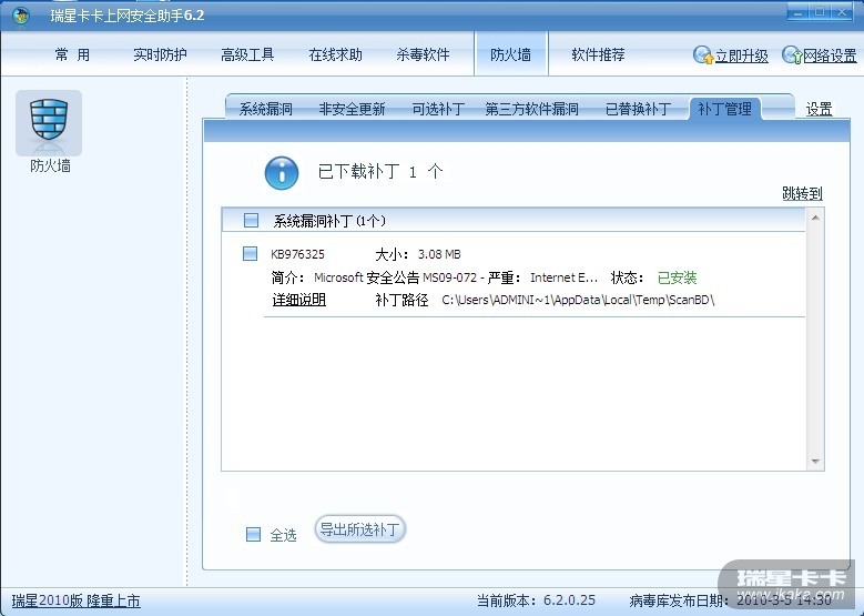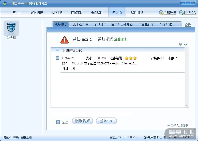 说明:近日在使用瑞星全功能安全软件时,通过安检时发现系统有漏洞,就点击了“详细报告”,之后打开的卡卡全功能安全软件扫描系统漏洞,却只有一个漏洞。之后用卡卡对这个漏洞打补丁,但是卡卡提示已经安装了,可是重新扫描后,卡卡又提示未安装该补丁程序。其实这个问题已经发现有半个月了,只是一直没有在意,但今天看到瑞星说建立了亚洲最大的云安全中心,就再次看了一下这个问题,但依旧存在。其他不多说了,希望瑞星解决一下这个问题。看截图: