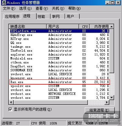卡卡昨天(3月8日)升级到6.2.0.28后,打开卡卡主程序,界面显示不全(怀疑与新增的皮肤有关),Ras .exe狂占cup(50%左右),系统卡死,家里三台机器都(一台式机,两本子)如此,都是新配双核机器,结束进程系统恢复正常。
