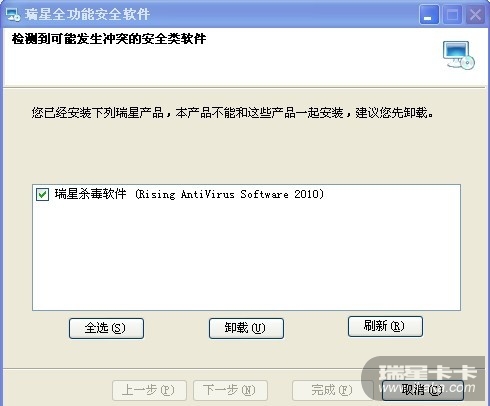今天装的瑞星,要求装防火墙,我也下了瑞星的,先装的瑞星杀毒软件,后面是全功能安全软件,但出现如图所示
