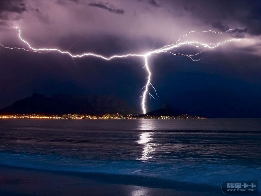 两道闪电在南非开普敦平顶山上空交汇,这是电在自然界中的惊人展示。