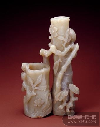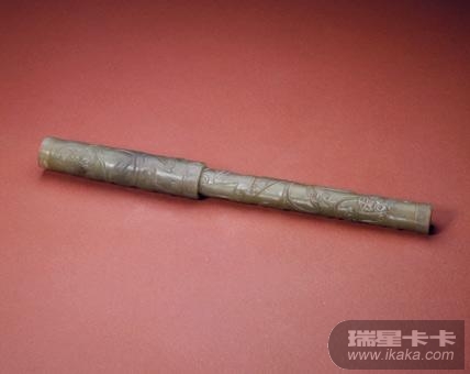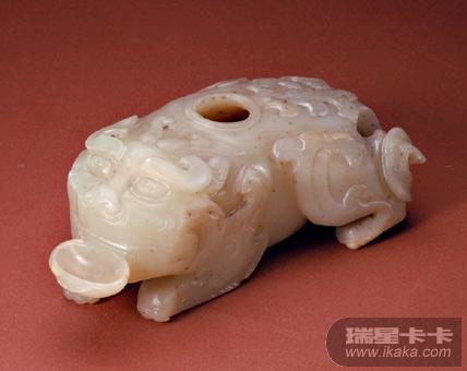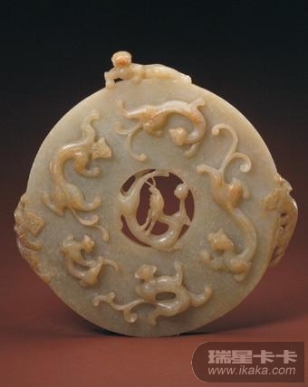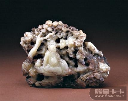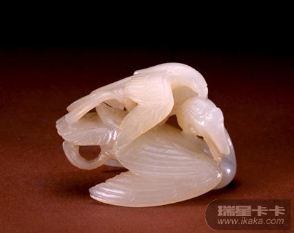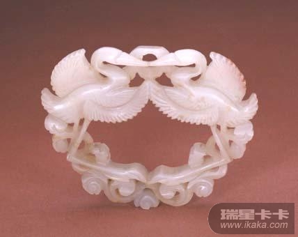 玉荷鹭纹炉顶,宋或金,高5cm,底径4.3-4.7cm。清宫旧藏。 炉顶玉质白色而局部为黑色,整体近似圆柱形,顶部略细,镂雕荷叶、芦草缠绕状,荷叶巨大而张开。一张荷叶上有黑色乌龟爬行,口吐烟云,其旁有荷花,荷、芦中可见5只鹭鸶隐现其间。器底部有一平板以示水面,其上有孔,可穿绳结系。 荷叶、水草、水鸟、龟等图案在宋、金玉器中非常流行。四川广汉南宋窖藏出土有龟巢荷叶带饰,北京丰台金代涡古沦墓出土有龟巢荷叶玉饰,与此作品应属同类题材。此外,上海地区的元代墓葬中也曾出土类似的饰荷叶、鹭鸶图案的炉顶。这表明此类作品的使用地域广泛,流行时间长,对后世玉器有很大影响。