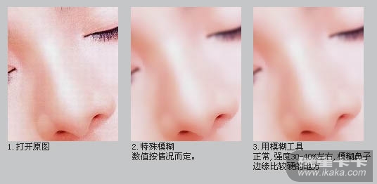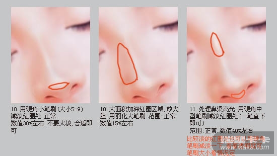 6、用吸管工具选择皮肤中中等偏亮的颜色,将皮肤过渡较大的地方盖住[灵活运用不透明度等]用大柔角笔刷。我一般是盖比较深的眼黑和脸部边缘较深的地方。新手注意:建议新手只盖住下眼睑,把握不当可能使脸变花。当然,如果盖色太浅,深了又不自然,就调亮原图。