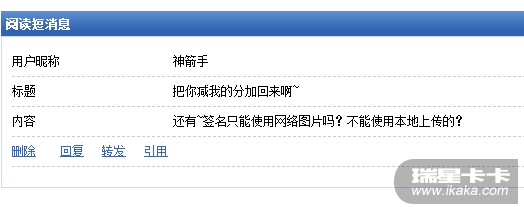 2.我当时认为楼主就签名问题。频繁站务发帖,都是可以在茶馆很好得到帮助的帖子.http://bbs.ikaka.com/showtopic-8723654.aspx  http://bbs.ikaka.com/showtopic-8723927.aspx  http://bbs.ikaka.com/showtopic-8723809.aspx  和鉴于第一条最后一个.可以明显看到img代码可用..还是在站务又重新开贴.我当时认为.楼主没有很认真的看他第一帖子回复他的那个人的截图导致.所以才扣分.并且同时加上第一个帖子连接(如图)