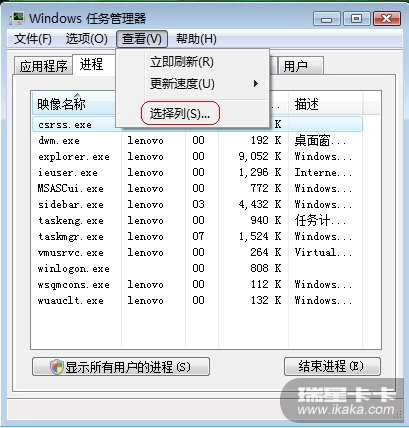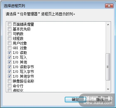 2、在"选择进程页列.中将.I/O读取..I/O写入..I/O其他..I/O读取字节..I/O写入字节..I/O其他字节,点击确定