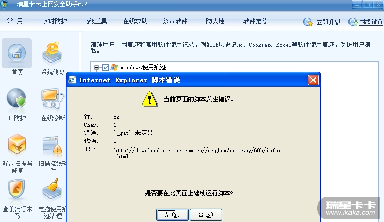 最近,我发现不管是在台式机上还是本本上,每当我打开卡卡安全助手后,不久后都会弹出一个脚本错误的对话框,开始我也没觉得有什么,之不过出现这个脚本错误的对话框后,点击右上角的关闭就行了,卡卡的其它功能都能正常使用。可是现在有时不是在打开后出现脚本错误的对话框,而是在使用中比如清理使用痕迹后会出现,这时就要先关闭这个脚本错误的对话框,然后才能执行清理痕迹的操作,很是麻烦。想请教一下:卡卡安全助手在打开或使用过程中时常弹出一个脚本错误的对话框,这种情况是正常的吗?有什么方法可以解决让卡卡安全助手不要再弹出这个脚本错误的对话框?