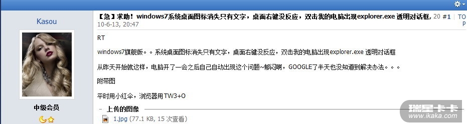 windows7旗舰版这几天常出现桌面全部没有图标显示,explorer.exe 假死的状态.只显示文字!,桌面右键没反应,双击我的电脑出现explorer.exe 透明对话框。而且最明显的就是托盘那里显示错乱还点击无效,任务栏基本失效,必须按Ctrl+Shift+ESC弹出任务管理器干掉explorer后重新运行它,不知道什么问题郁闷,前几天还好好的,估计是不是这几天更新的W7补丁导致,从装更新之后也是这样郁闷,跟新的都是推荐补丁,杀毒也没问题,全系统安全都检查过,无问题,昨天新装系统更新完,今天还是这样。,下面A-B 是我的图片,剩下的是网友的截图也是同样问题,希望高级技术员看看,到底是啥问题,以前从来没出现过,就这几天~