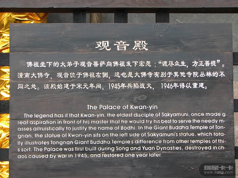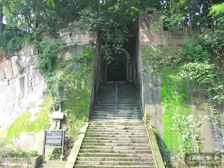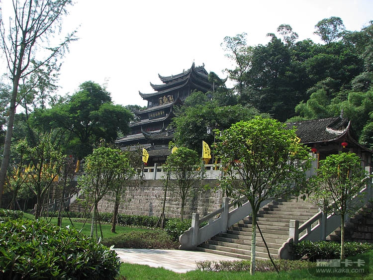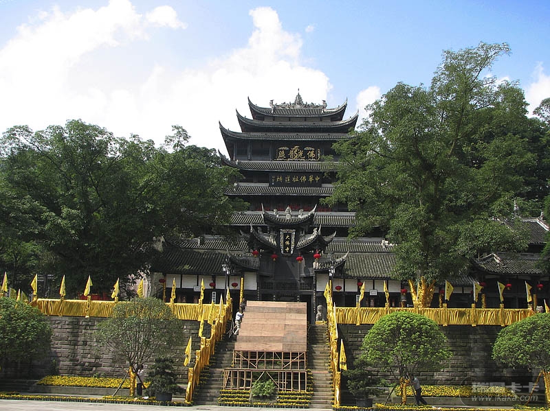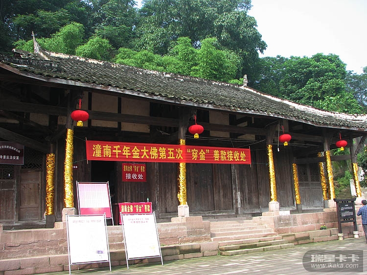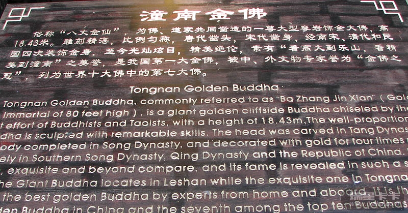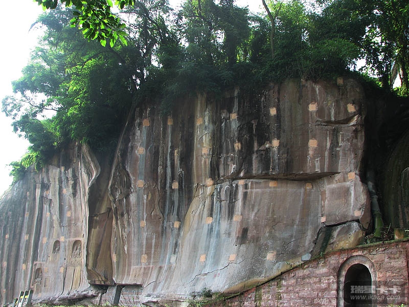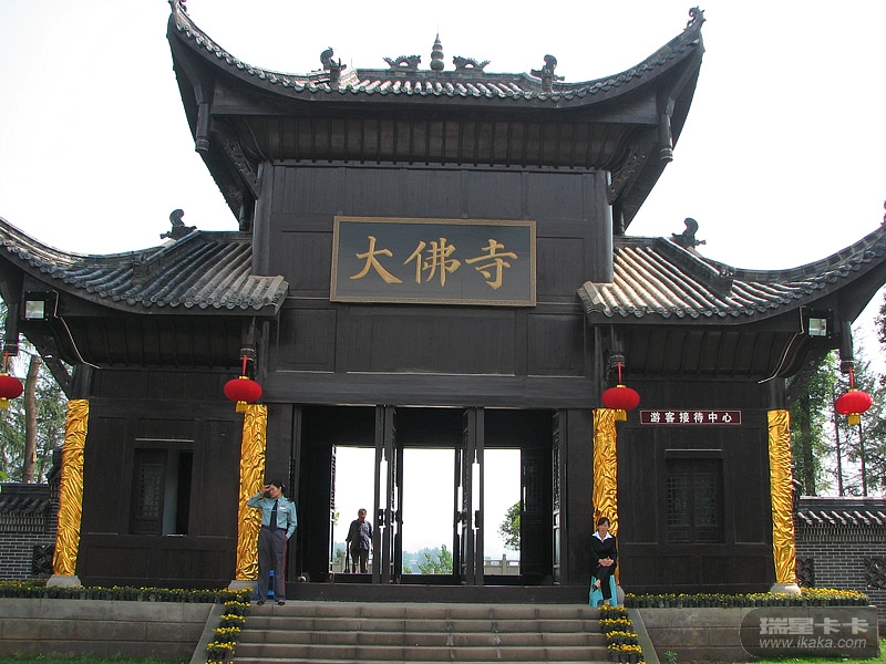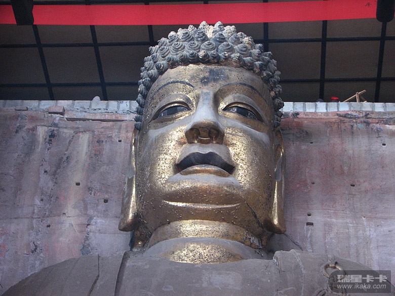 寺创于唐咸通年间(860-873年),初名“定名院”,又名“南禅寺”。后因宋朝在寺内依山凿一大佛,改称“大佛寺”。明朝在大雕像之上覆盖七重飞阁以蔽风雨,今尚完好,寺内古壁上存有历代名人题咏,其中飞霞、天开图画等,颇有艺术价值。该寺现在尚存大佛殿、观音殿、玉皇殿等木结构建筑,多系清末遗物。其中大佛殿堪称壮观,殿高33米,依山傍水,高阁飞檐,结构独特。殿内存释迦牟尼坐像一尊,周身贴金,金光灿灿。像高18.43米,胸围8.35米,结跏趺坐,头系螺髻,袒胸,套双领外衣,左手置于膝间,右手平胸,施无畏印,形态庄严肃穆,双目炯炯传神,气势尤为雄伟。
