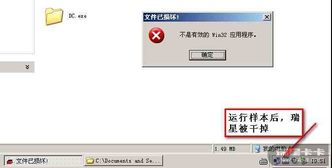 运行病毒样本,之后瑞星直接被干掉。(见图二)