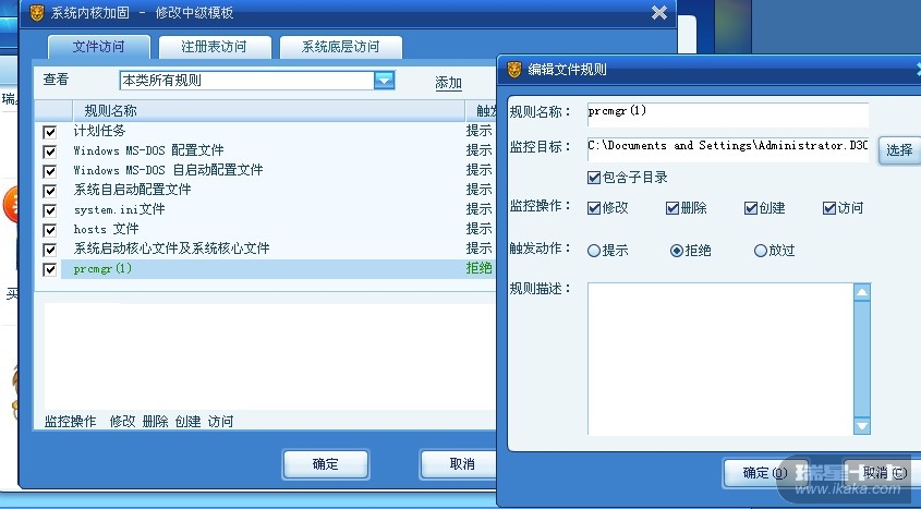 点开瑞星主界面的设置---电脑防护---系统内核加固---在中级模板中点修改---在文件访问中添加新规则,如下图,设置好后,还是可以正常访问、创建、删除设置的文件夹。
