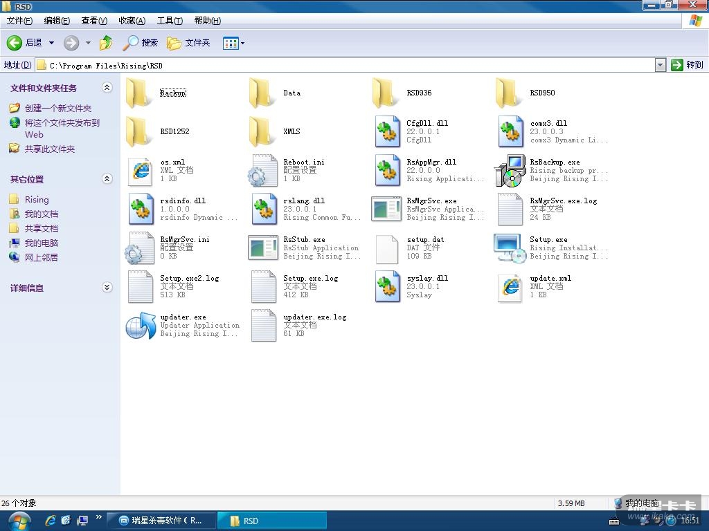 五分钟前升级瑞星 我点击的隐藏升级,结果出现下图【图一】的关机对话框和瑞星的提示,机子重启后瑞星没有了,而且开始程序那里没有了瑞星,在C盘瑞星安装文件夹内出现了新的文件夹 名字叫rsd,里面的截图如图二