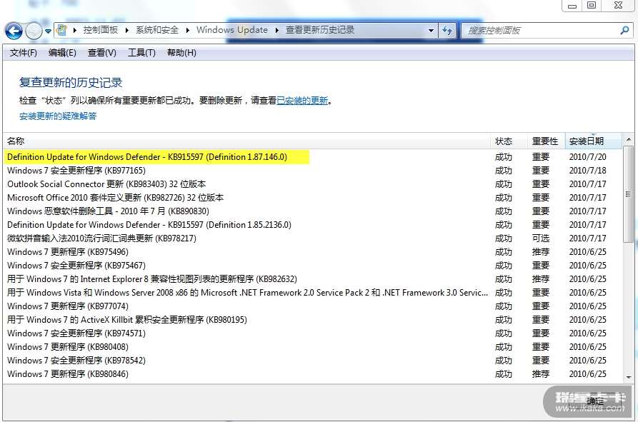图中还可以看到系统也提示成功安装更新了,但是马上会提示找到新的更新程序,而且内容与刚才被拦截的更新相同。这样反复多次了,直至关闭木马防御,才能真正安装成功。在更新记录中,可以看到多次安装同一更新,前几次都是被瑞星拦截的,最后一次是关闭木马防御的。