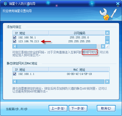 我使用ADSL接入网络。安装后,连接网络再运行设置向导,设置向导第二步,可信区设置,不但列出了宽带连接的IP,而且默认勾选了。