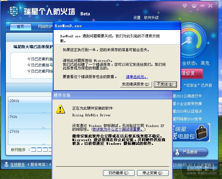 请楼主卸载防火墙后重新安装,在弹出硬件安装的时候,选择“仍然继续”。