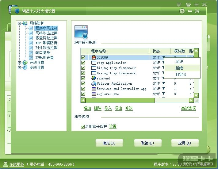 只有在程序联网规则处,比如QQ2009上的状态处“允许”上单击,然后选择“拒绝”,那状态处才显示“拒绝”,再单击应用,确定后,但最终还是允许QQ2009运行!