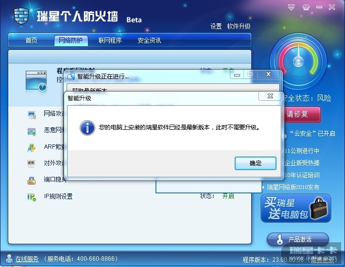 问题现象:防火墙提示“网络安全状态”显示为风险,“请修复”,点击“请修复”之后弹出软件更新窗口,但是提示已是最新版本。“点击”确定之后,软件仍旧显示“请修复”。附截图: