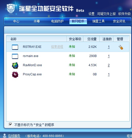在联网程序中,勾选“不显示标识为安全的程序”,分别为RSTRAY、RSMAIN、RAVMOND,均是瑞星自身。