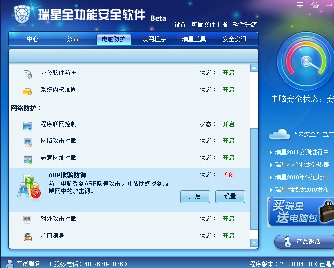 在系统托盘处点全功能安全软件的菜单“禁用所有电脑防护”再“开启所有电脑防护”后“ARP欺骗防御”监控无法自动启动,一直处于关闭状态,必须手动开启,试过很多次都无法自动开启