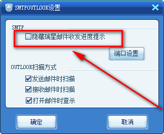 出现问题前的操作步骤:设置-电脑防护-邮件监控-邮件客户端参数设置-取消勾选“隐藏瑞星邮件收发进度提示”