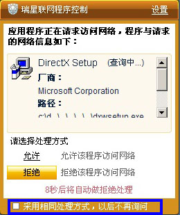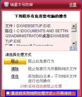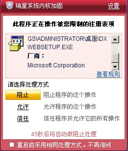 如下图,我想知道蓝色标注区中选项的意思是“重启前该程序的所有操作不提示,还是重启前所有进行该操作的程序都不提示”希望瑞星说明白,方便用户选择。
