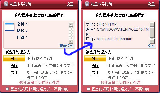 如下图,希望瑞星能够在一个大的提示窗口中显示所有信息,包括:危险等级、文件名、文件完整路径、名称、类型、描述。