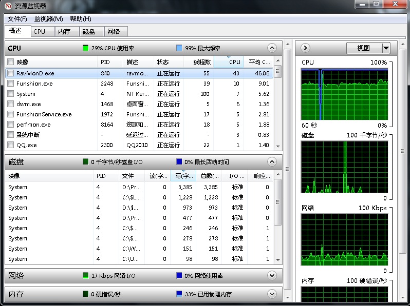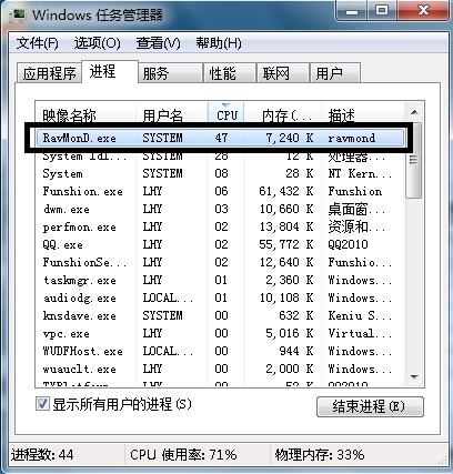 结果:风行和QQ经常假死,系拖慢了系统反应速度,打开任务管理器,发现ravmond 占用资源过高,就是关闭就是关闭电脑所有保护,ravmond依然占用50以上!!!