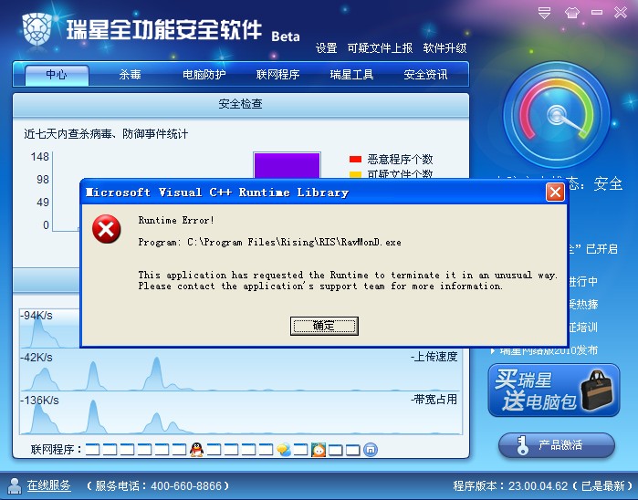 瑞星就一直报如下错误,过大概10秒钟一次,在更新前用的时候一直都是没有这个问题