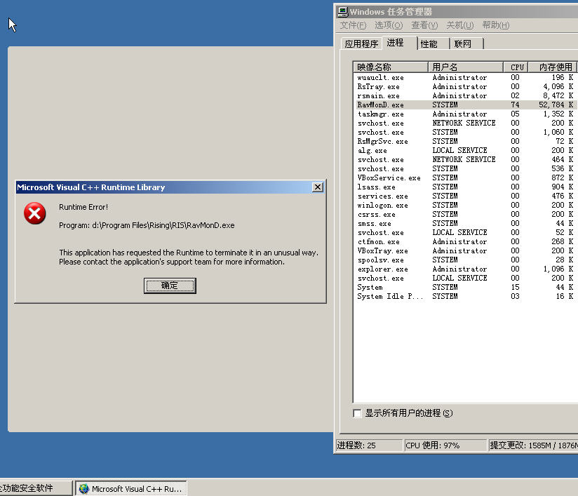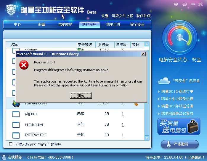 如下图,在进行界面操作时突然崩溃。崩溃后瑞星监控中心显示所有监控开启,事实上RAVMOND.exe进程已经崩溃退出,所有监控均已失效。