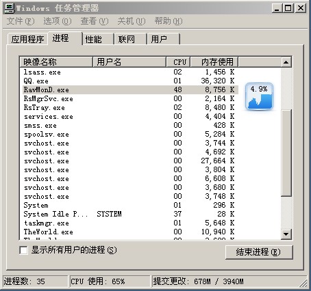 问题现象:只要开启迅雷下载软件,瑞星的RavMonD.exe进程的CPU占用率就会达到50%一直不下,关闭迅雷后也无济于事,只有重启电脑才能解决。
