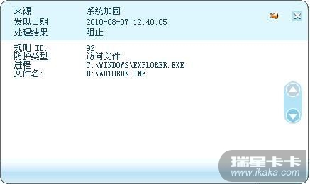 正常现象。explorer.exe在打开硬盘时会访问autorun.inf。你可以把它理解为系统自身的文件机制,而开了系统加固之后被瑞星拦截并记录。这个问题不需要处理。即便是有病毒也会被瑞星杀掉,所以不必担心。具体可参见http://bbs.ikaka.com/showtopic-8675356.aspx2楼回复和http://bbs.ikaka.com/showtopic.aspx?forumid=28&topicid=8699472&go=prev9楼回复