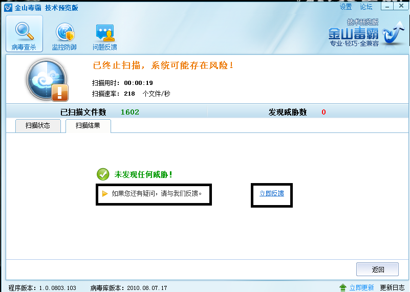 建议瑞星在 全盘扫描  快速扫描  自定义扫描 -----扫描结束后 能显示