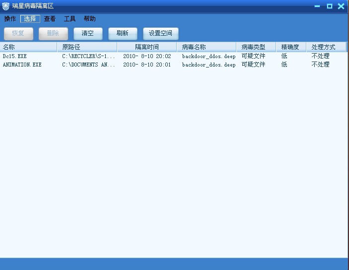 问题现象: 图片上的两个文件是一样的文件,但为什么在隔离区,第一个文件就会命名为DC15.exe?这是瑞星自动命名还是文件自身在改变名字?